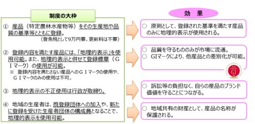 地理的表示(GI)とは 本日のテーマ「地理的表示(GI:Geographical Indications)」を知る。 概要 地域には、伝統的な生産方法や気候・風土・土壌などの生産地等の特性が、品質等の特性に結びついている産品が多く存在おり、これらの産品の名称(地理的表示…